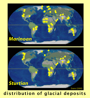 1. The global distribution of Sturtian and Marinoan glacial deposits, and the broad synchroneity of the latter based on seawater carbon isotope anomalies consistently framing the glacial strata.