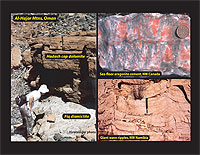 4.10: Contact (left) between the younger Cryogenian (Marinoan) cap dolostone (Hadash Formation) and the Fiq Formation glacial diamictite, Wadi Hajir, Oman Mountains, Oman. Characteristic structures in younger Cryogenian cap carbonates (right): giant wave ripples in the Keilberg cap dolostone, NW Namibia, sea-floor cements (former aragonite crystal fans) in the Hayhook cap limestone, NW Canada.