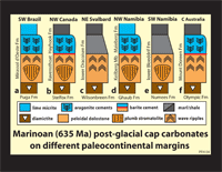 4.12: Stratigraphic comparison of younger Cryogenian (Marinoan) cap carbonates in Australia, Brazil, Canada, Svalbard, NW Namibia (Congo craton), SW Namibia (Kalahari craton), and Svalbard.