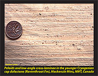 4.19: Cross-section of the crest of a giant wave ripple in the Ravensthroat cap dolostone, NW Canada, showing characteristic bidirectional laminae and chevron-like up-building. Coin is 2 cm in diameter.