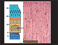 4.30: Transitions from Ravensthroat cap dolostone to Hayhook cap limestone in which the sea-floor barite cements (pseudo-stromatolites) have been replaced by calcite (below) and a solution-collapse mini-breccia (above). Barite replacement and dissolution probably occurred under the influence of reducing groundwaters percolating downward from the directly overlying black pyritic shale (>700 m thick) of the Sheepbed Formation. Note palimpsest growth laminae in the calcitized barite pseudo-stromatolites.