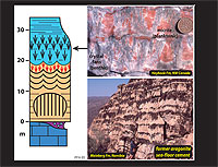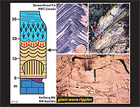 4.18: Giant wave ripples in the Keilberg cap dolostone (below), NW Namibia and the Raventhroat cap dolostone (above), NW Canada (cross-section, left; synoptic morphology, right).