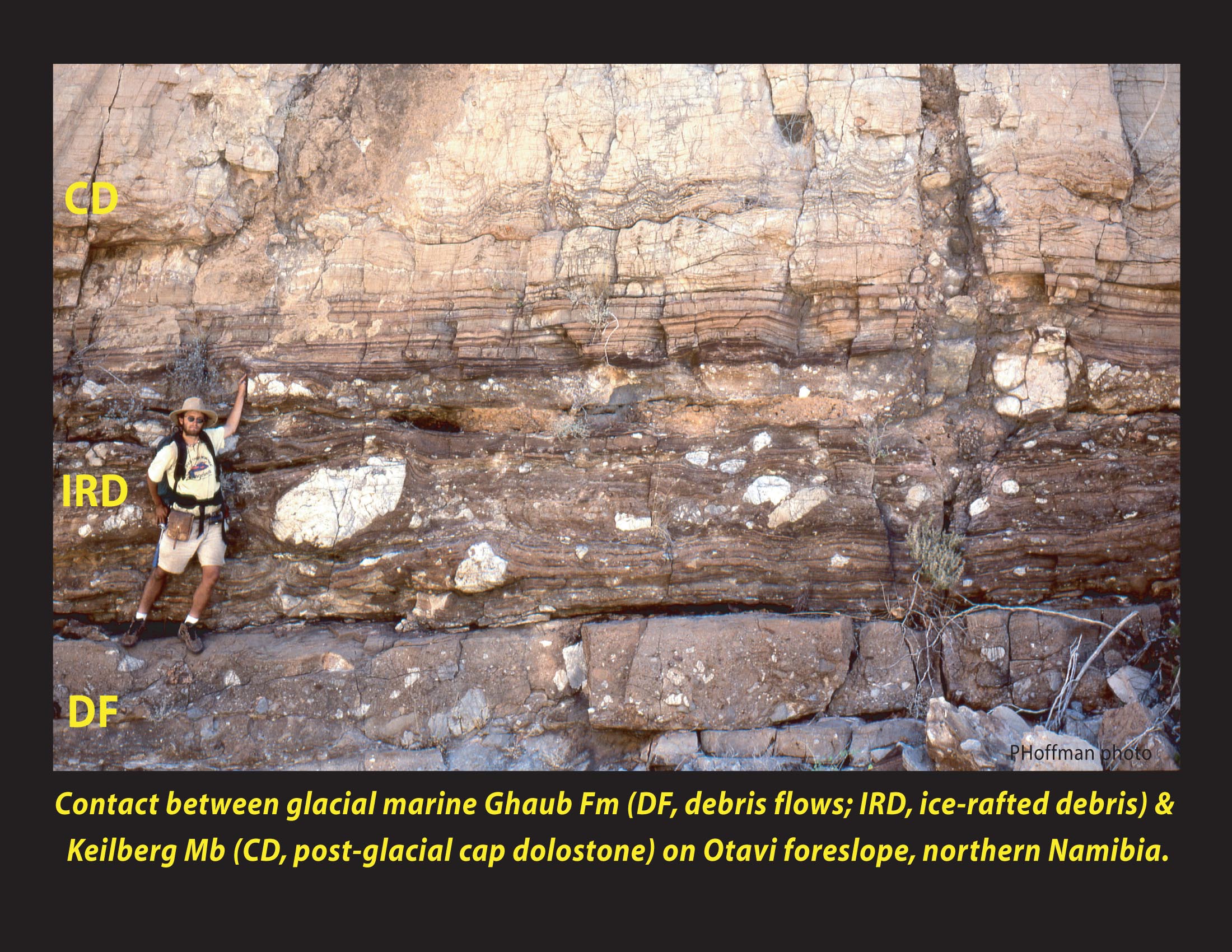 4.2: Contact between the younger Cryogenian cap dolostone (CD) and proglacial marine deposits (DF, debris flows; IRD, ice-rafted debris) of the Ghaub Formation (635 Ma), near Narachaams se Pos, southern foreslope of the Otavi Group, Namibia.