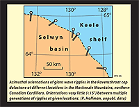 4.21: Azimuthal orientations of giant wave ripples in the Ravensthroat cap dolostone at different locations near the contemporaneous shelf-slope break in the Mackenzie Mountains, northern Canadian Cordillera. Orientations in Namibia are also subnormal to the shelf-slope break.