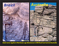 4.23: Giant wave ripples in Marinoan cap dolostones in SW Brazil (cross-section and morphological cast) and central Australia.