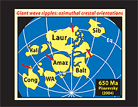 4.25: Tentative paleogeographic reconstruction of continents in the southern hemisphere at ~650 Ma (after Murphy et al., 2004) showing regional average azimuthal paleo-orientations (red bars) of the crestlines of giant wave ripples in 635-Ma cap dolostones in NW Canada, East Svalbard, SW Brazil and NW Namibia (Paul Hoffman unpublished observations).