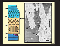 4.28: Thin section of sea-floor barite from the Ravensthroat cap dolostone, NW Canada. Note growth layers in 1st-generation barite (b1) "fingers", and step-outs of 2nd-generation barite (b2) on laminae of peloidal dolostone (dm) deposited between the barite fingers. The b1 barite fingers must therefore have projected above the sediment-water interface and were precipitated directly from seawater, unlike most sedimentary barite which precipitates from pore-waters during diagenesis.