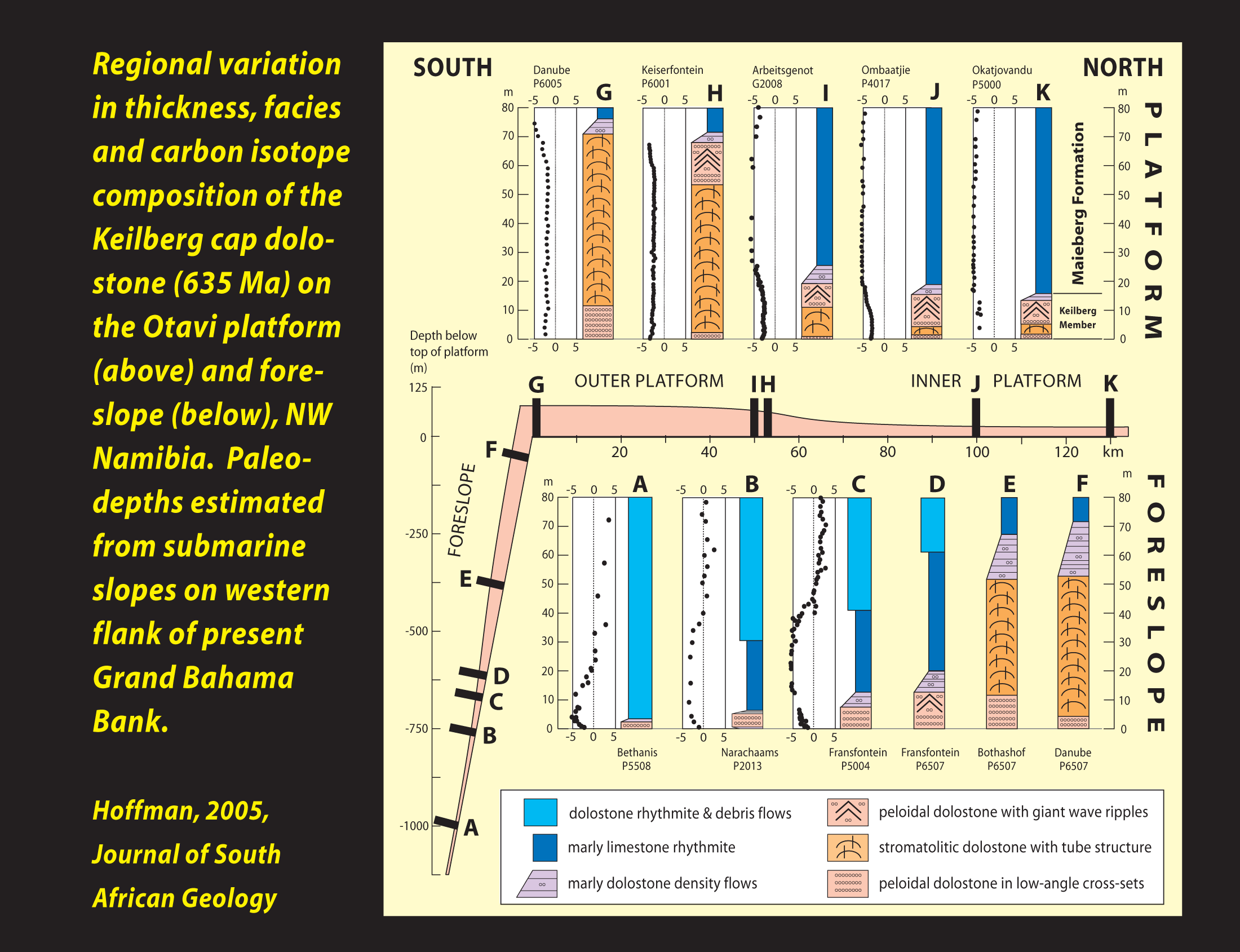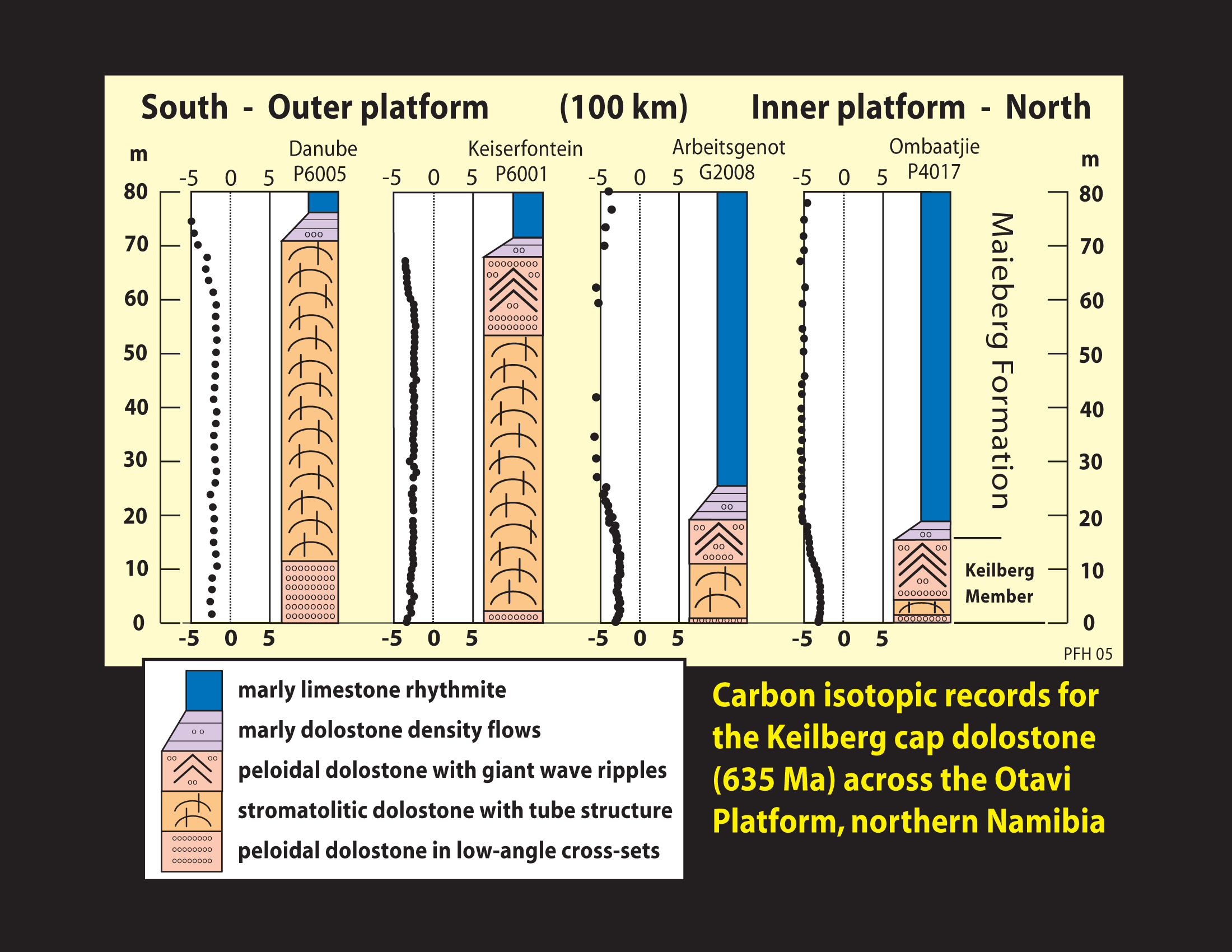 4.41: Sedimentary facies and carbon isotopes of the Keilberg cap dolostone across the Otavi carbonate platform in northern Namibia.