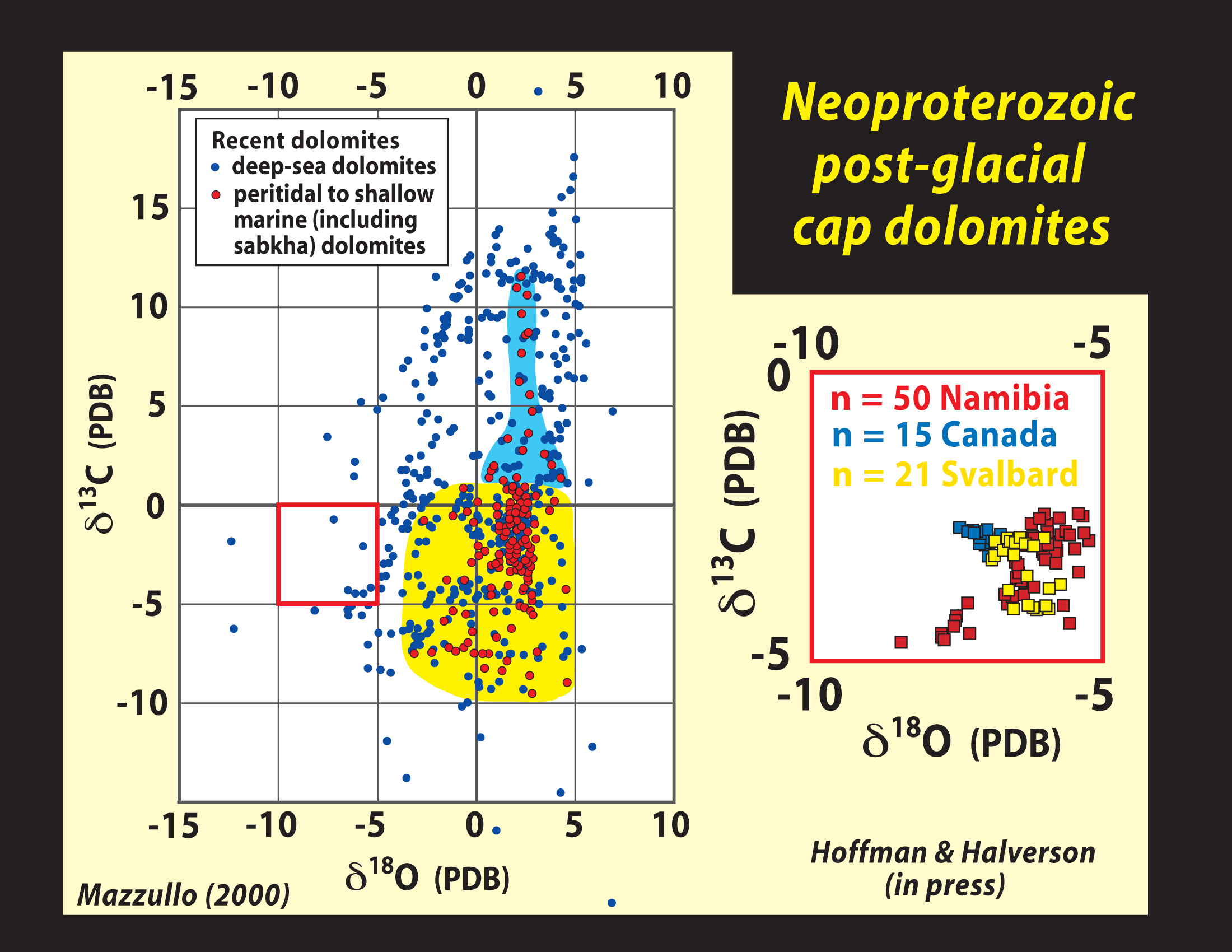 4.42: Carbon/oxygen isotope cross-plot for Holocene "organogenic" secondary dolomites (Mazzullo, 2000). Large variations in carbon isotopes are caused by production of 13C-enriched CO2 during methanogenesis and 13C-depleted CO2 during bacterial sulfate reduction. This contrasts with tightly clustered isotopic data from 635-Ma cap dolostones in Namibia, Svalbard and NW Canada, which are interpreted to reflect equilibrium with contemporaneous seawater.