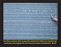 4.48: Sea-floor cement (pseudomorphosed aragonite crystal fans) in the Sete Lagoas cap-carbonate sequence above the older Cryogenian(?) glacials (Macaubas Formation) in the Bambuí Group on the Sao Francisco craton, SE Brazil.
