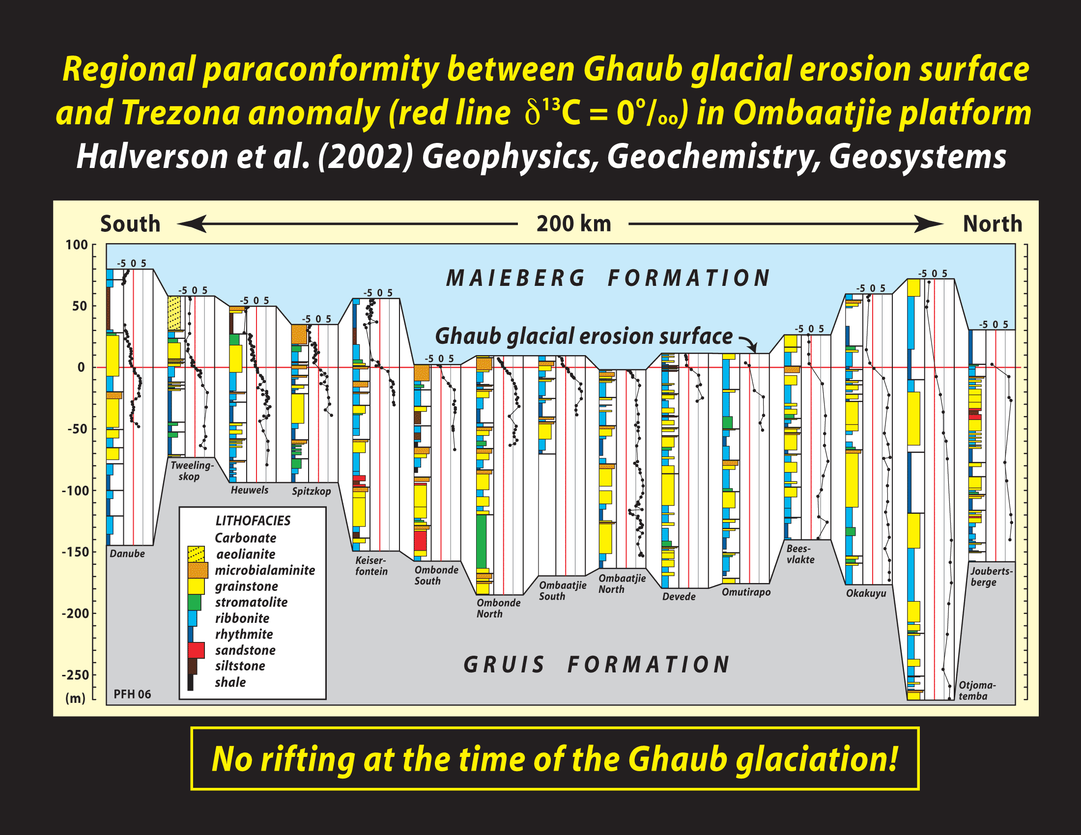 Stratigraphic architecture, generalized sedimentary facies, U-Pb ages of volcanic zircons and composite carbon isotope profile for the Otavi Group, projected onto a north-south cross-section of the carbonate platform and its southern foreslope. Note rift-drift transition at the base of the Ombaatjie Formation. The 635-Ma Ghaub glaciation occurred after the rift-drift transition and the older Chuos glaciation before it.