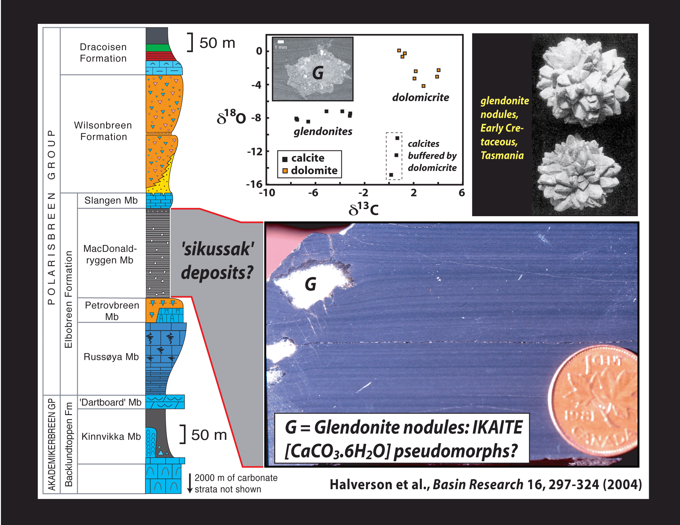 calcite nodules (glendonites, pseudomorphic after ikaaite) interpreted
