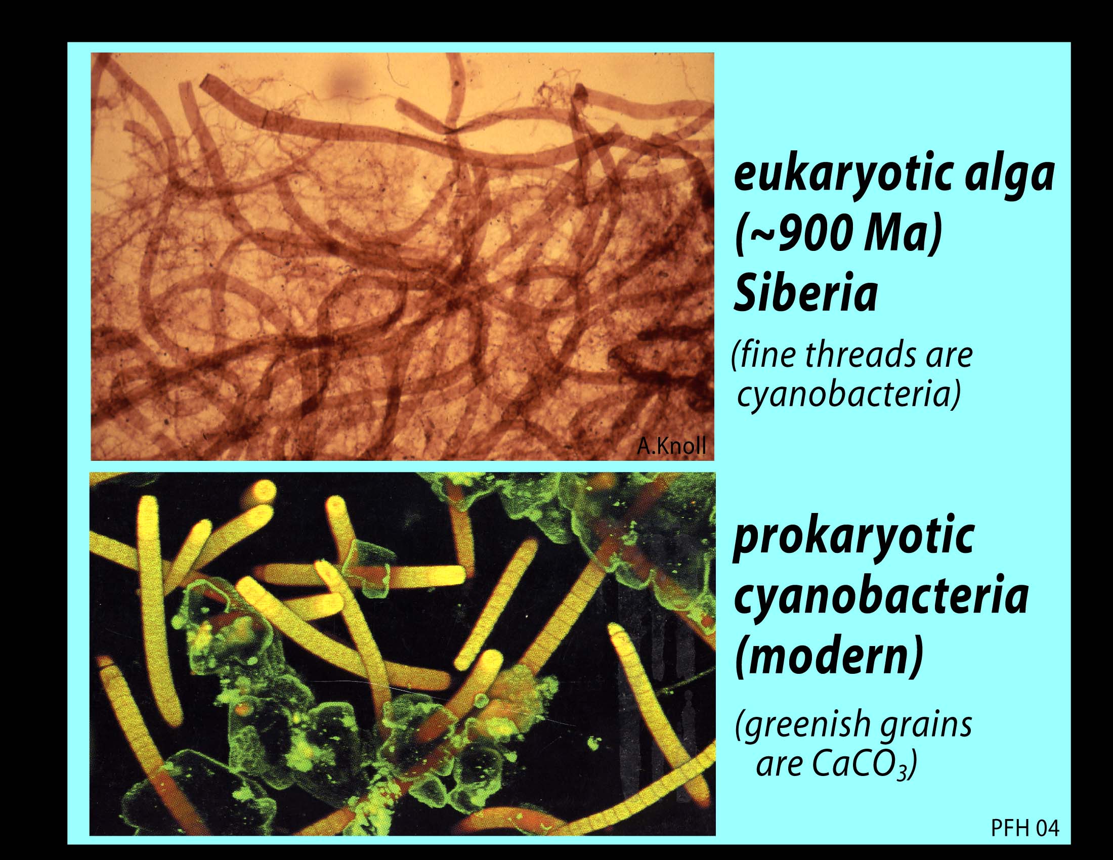 Modern cyanobacterium (below); eukaryotic (vaucherian) alga from the