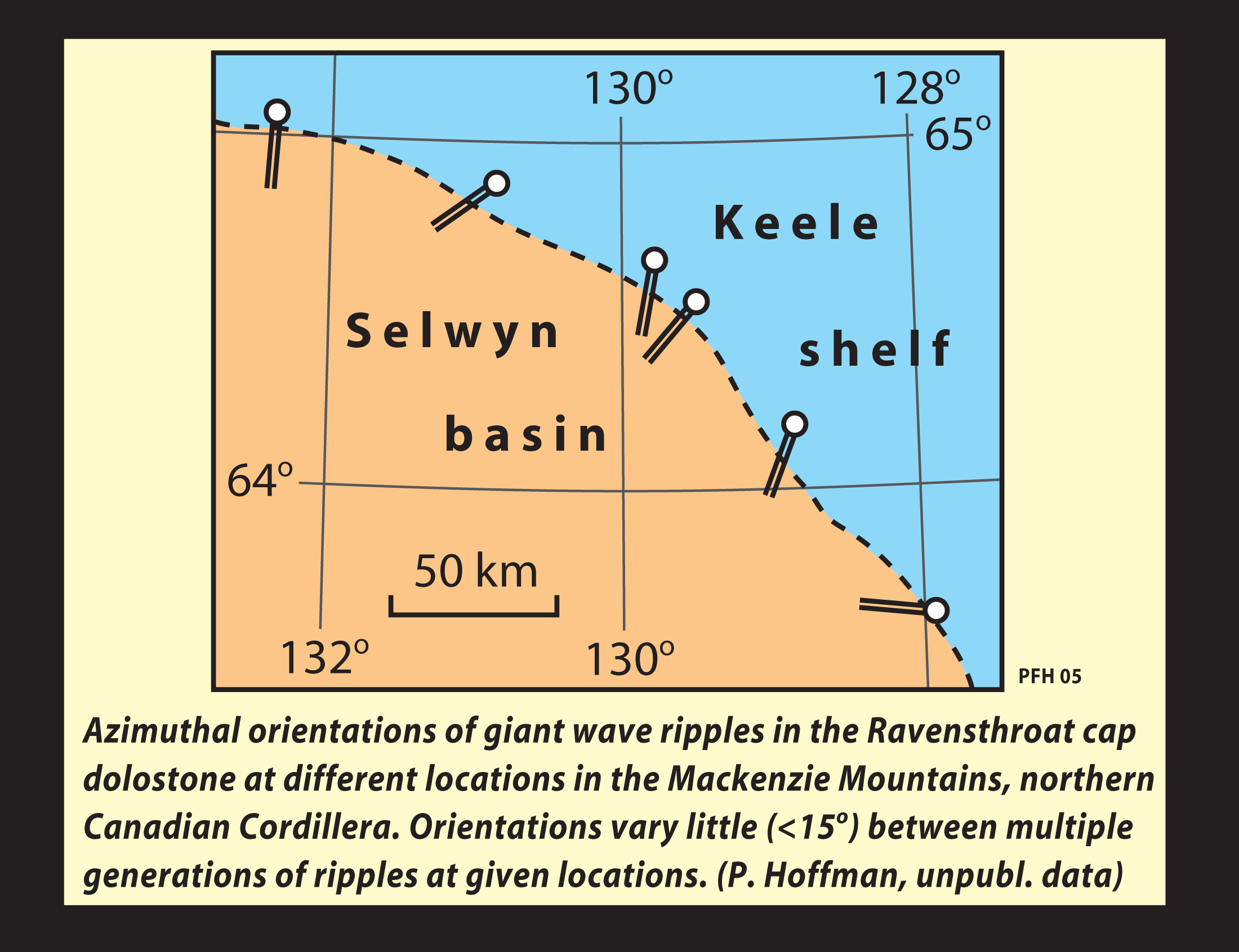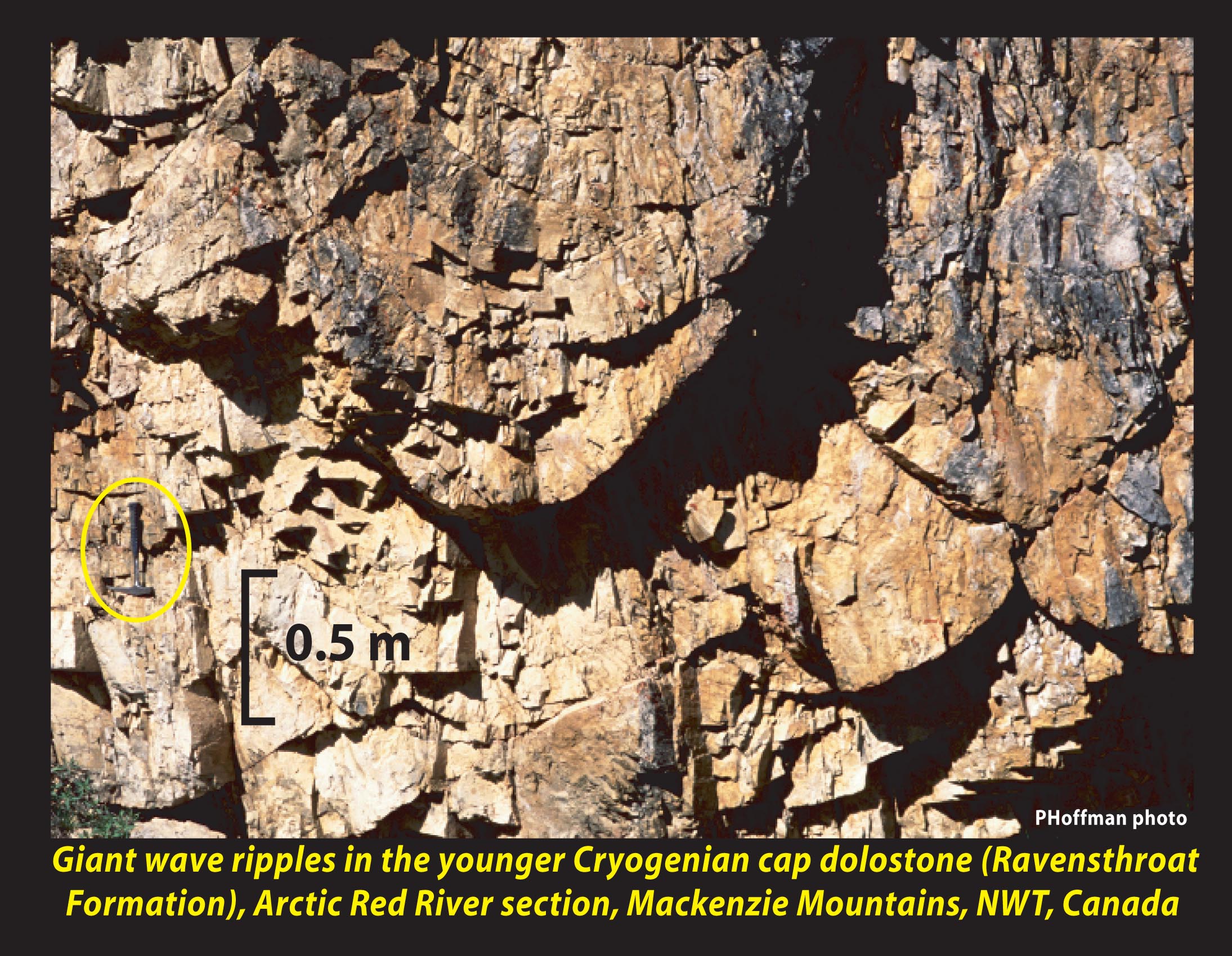 Giant wave ripples in the Ravensthroat cap dolostone, NW Canada, showing