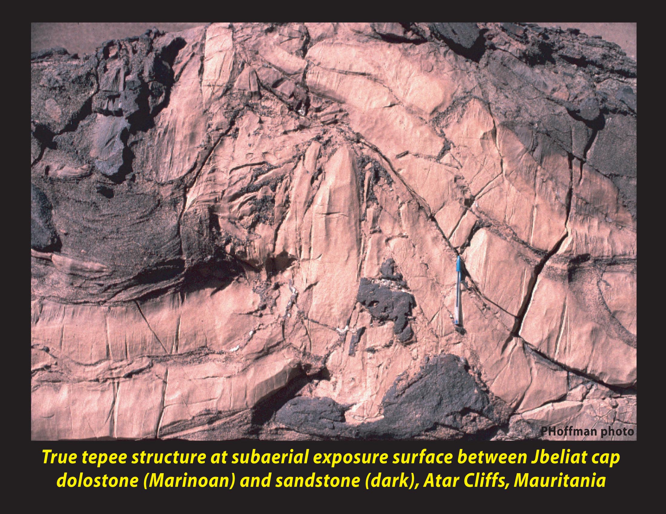 Oman. Characteristic structures in younger Cryogenian cap carbonates (right):