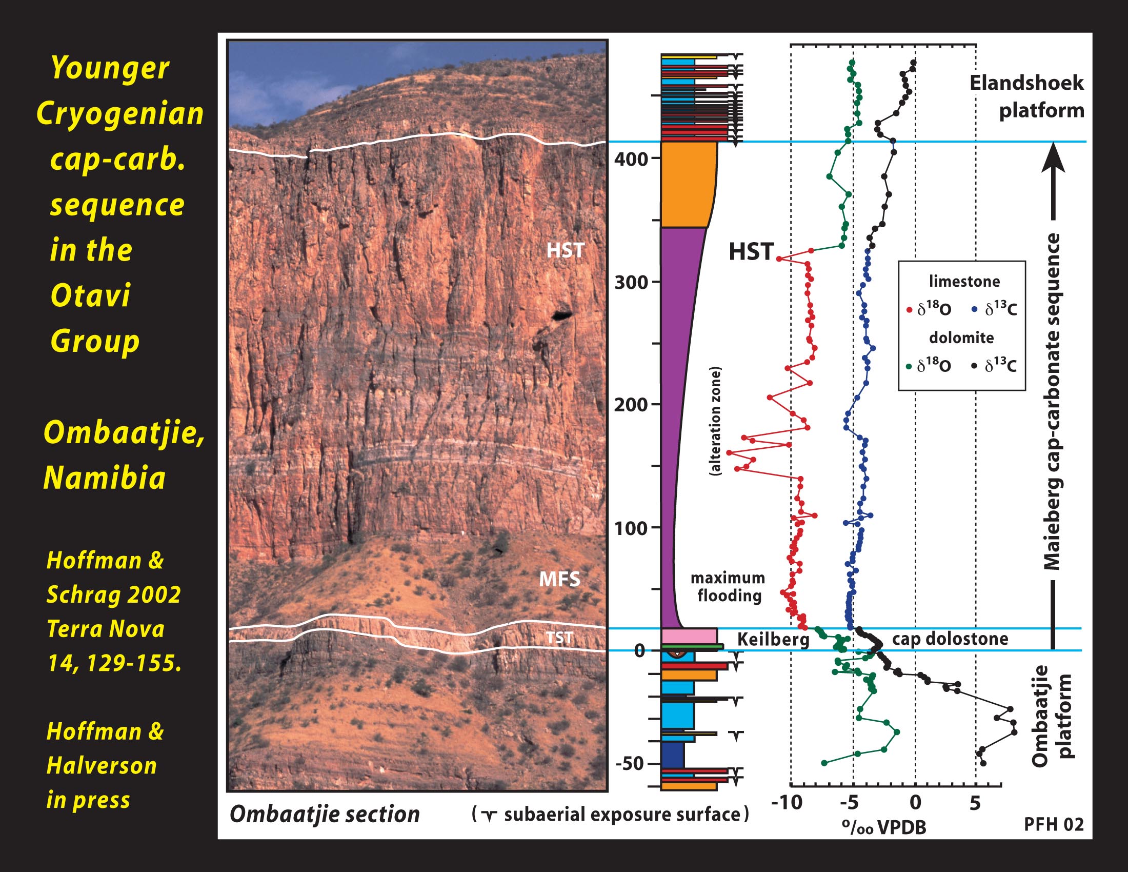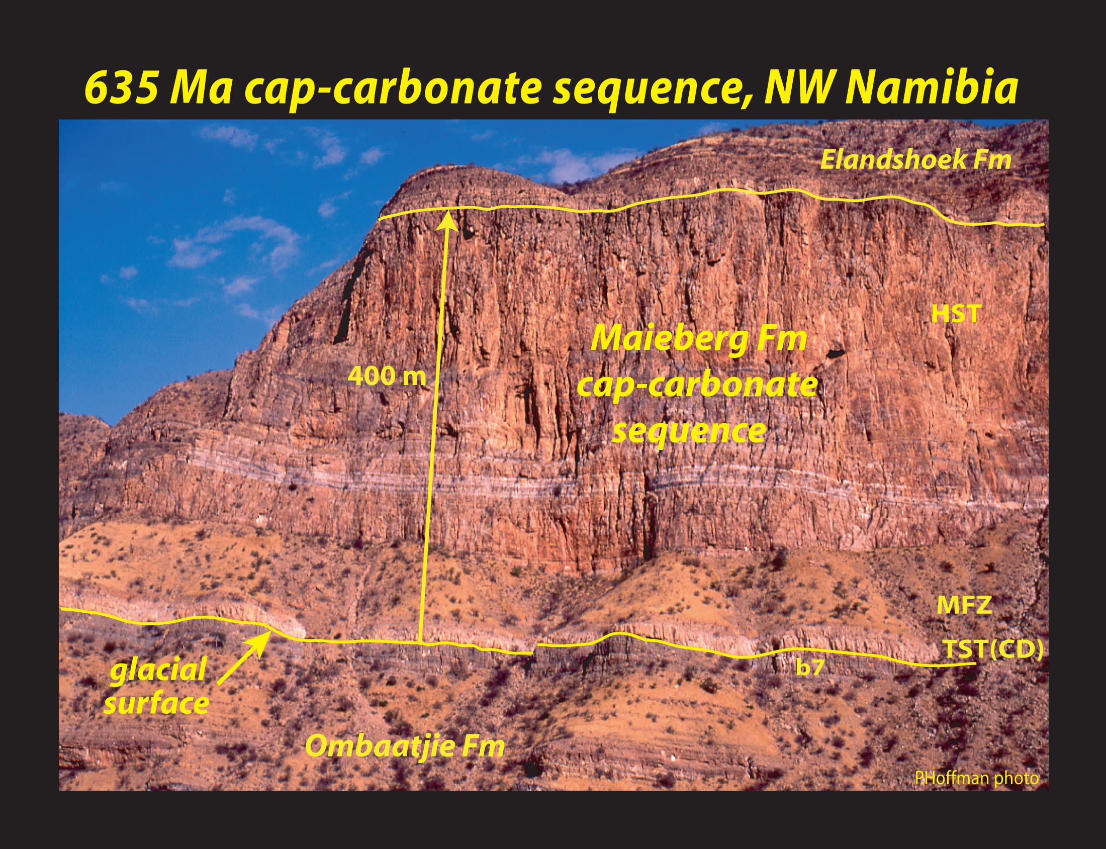 near Obaatjie, NW Namibia. TST (CD), Keilberg Member cap dolostone; MFZ,