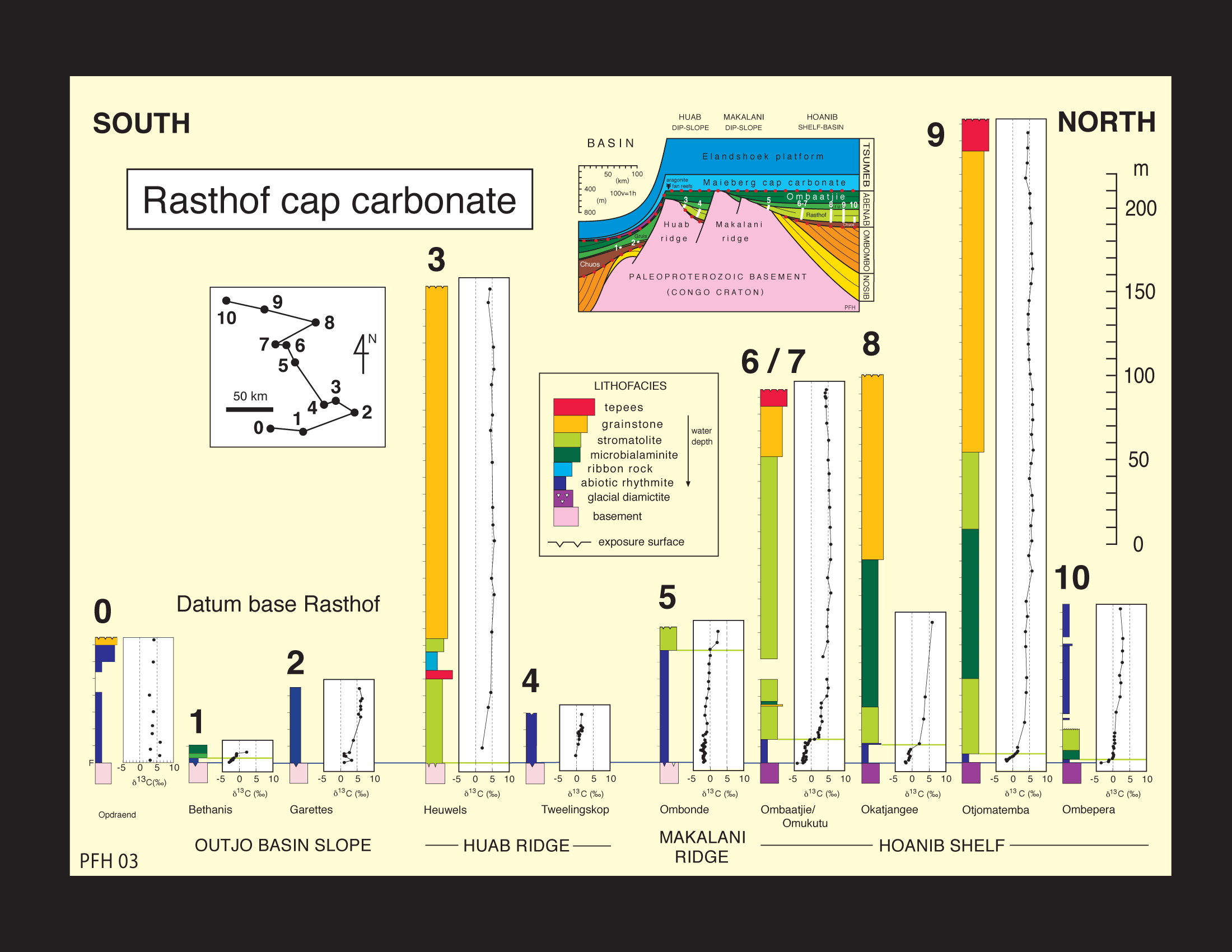 Stratigraphic architecture, generalized sedimentary facies, U-Pb ages of volcanic zircons and composite carbon isotope profile for the Otavi Group, projected onto a north-south cross-section of the carbonate platform and its southern foreslope. Note rift-drift transition at the base of the Ombaatjie Formation. The 635-Ma Ghaub glaciation occurred after the rift-drift transition and the older Chuos glaciation before it.